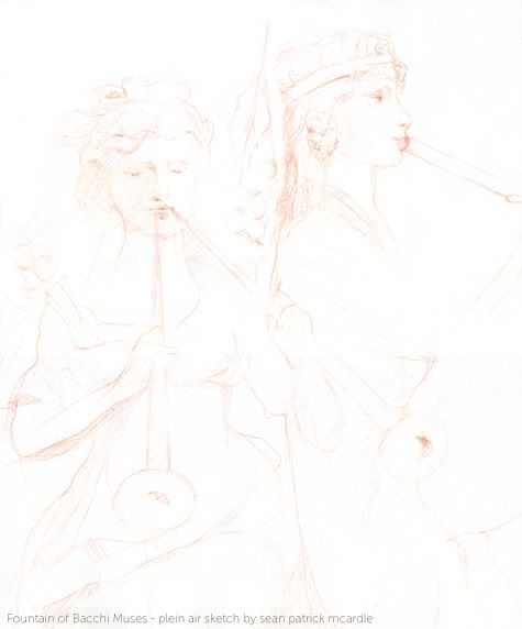 Amused by the presentation, I later visited the winery to view his art collection, have a glass of wine and do a little plein air sketch of this beautiful Fountain of Bacchi, nymphs and muses - made of bronze, 17th century Italy.